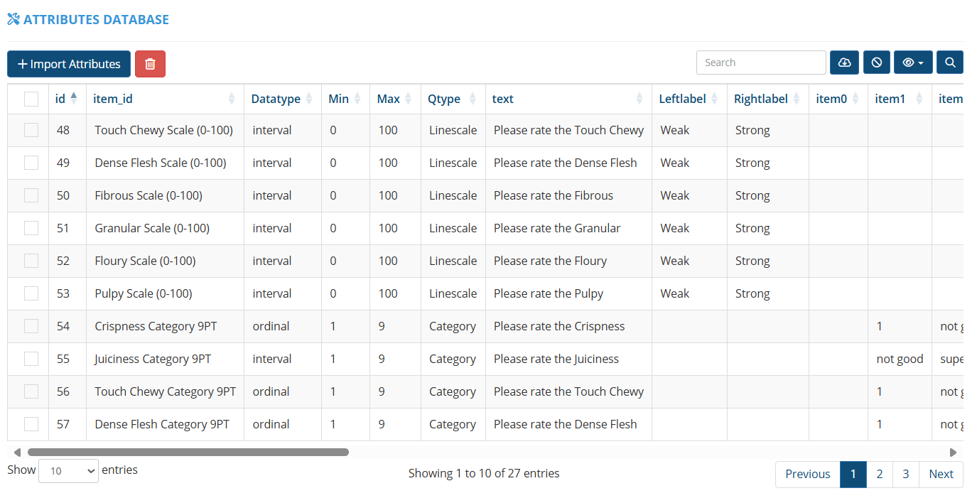 EyeQuestion offers three types of databases, namely the Attribute Database (ADB) for storing attributes and adding questions in bulk, the Product Database (PDB) for storing product-related information such as brand, EAN etc. and the Central Database (CDB), which is useful for comparing interval (scale) data across projects.