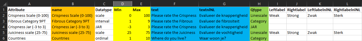 To add attributes into the database you need to create an excel file with data first. This is an example of how a datasheet could look like. There are no restrictions in place on how to set up the attribute properties.