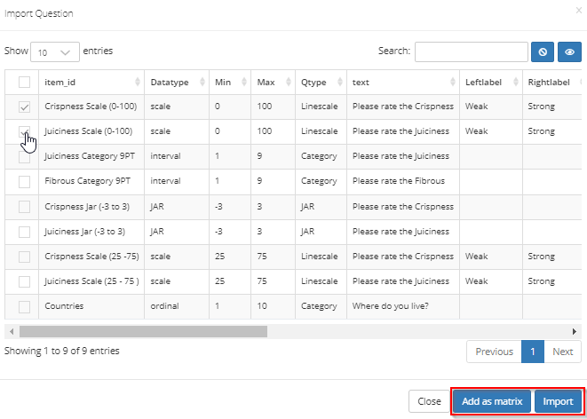 Select the attributes you want to import to your questionnaire by ticking the box and click the import button.