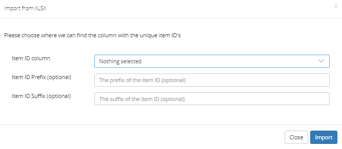 Then you need to give an unique ID to the attributes from the imported datasheet. This you will do by selecting an item ID column using the drop down function. Optionally, a prefix and suffix can also be set up. After the properties have been set up click on the import button to add the data to the attributes database.