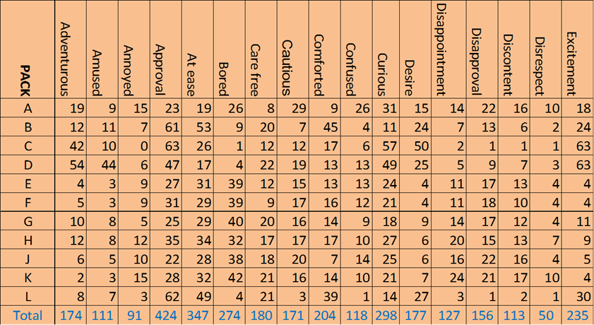 This is an example of typical data that can be mapped – this could come from a CATA study, counting up the number of checks, or it could be any other categorical table of counts: