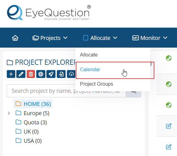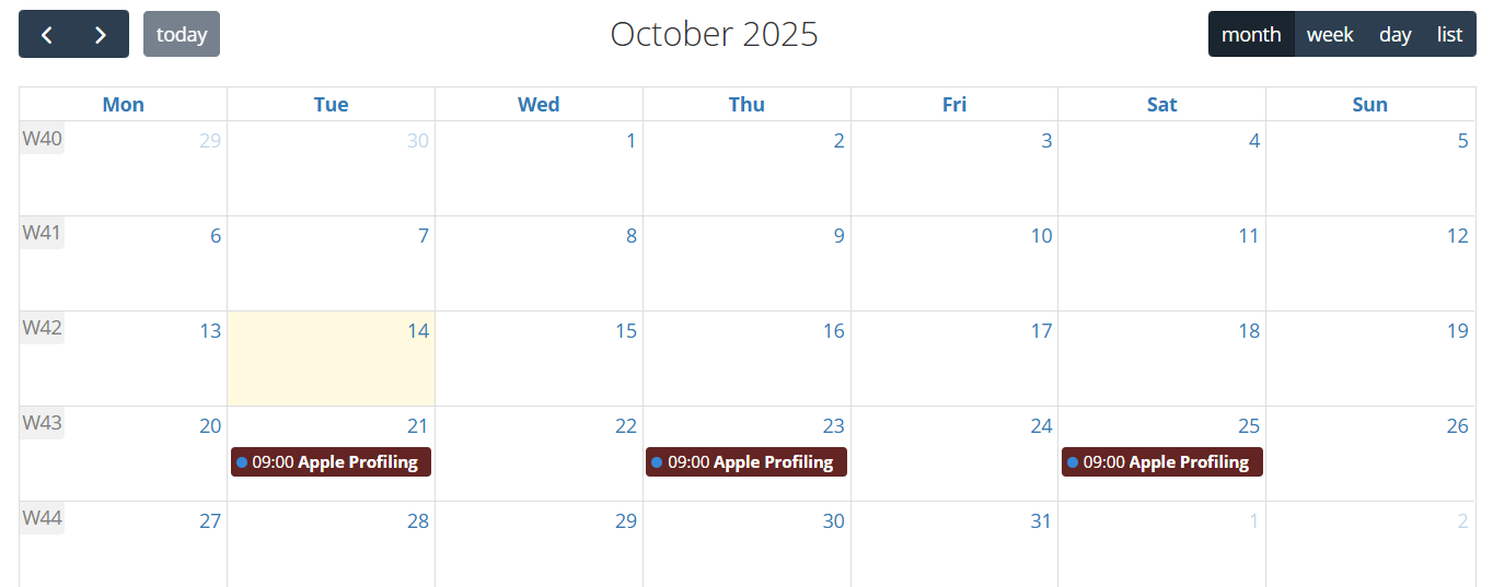 The Calendar feature provides a central overview of all projects that have scheduled time slots through the appointment scheduling functionality. Once time slots are created within a project, they automatically appear in the calendar view, allowing users to visualize and manage their scheduled sessions efficiently.