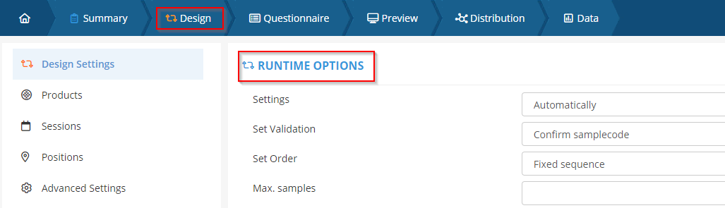 Max. Samples establishes the maximum number of samples that a respondent can evaluate and can be used if not all samples from the set need to be evaluated.