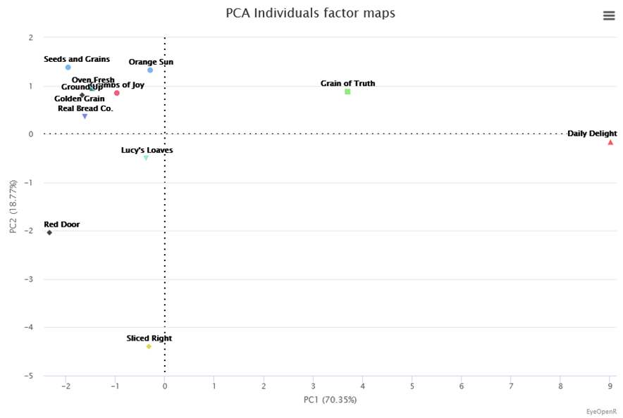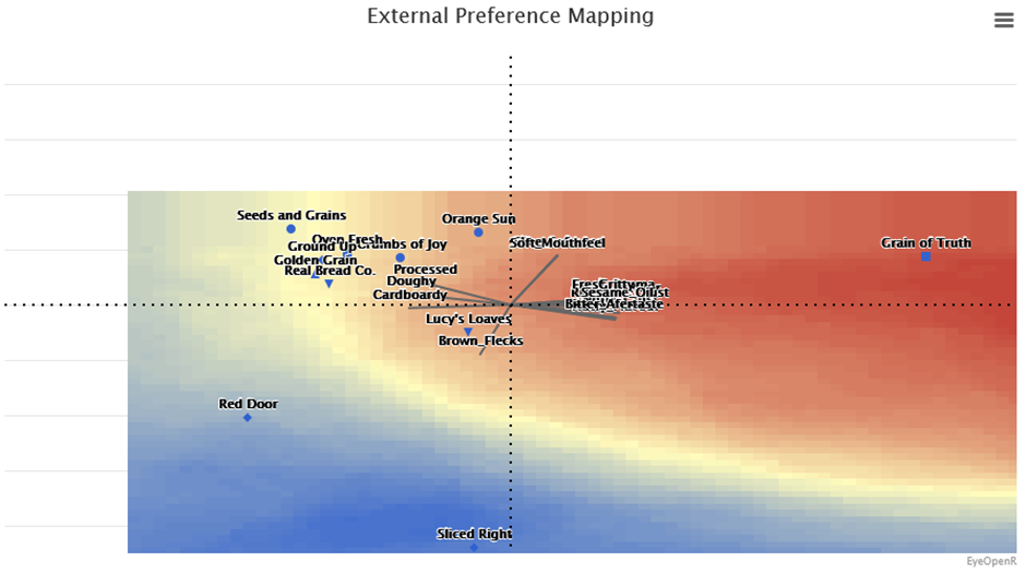 The main graphical outputs are shown below. The first two plots are the PCA product scores and variables loadings plots for the first two dimensions; these are only generated if the user chooses the ‘pre-transformation’=PCA option. The third plot shows the external preference map itself, which clearly shows that ‘Daily Delight’ bread is well placed in the darkest red region, while the ‘Sliced Right’ bread is poorly liked as it is in the darkest blue region. All three plots were generated using the example breads data set, using a correlation PCA on all attributes, the elliptical model option, and a grid size of 100.