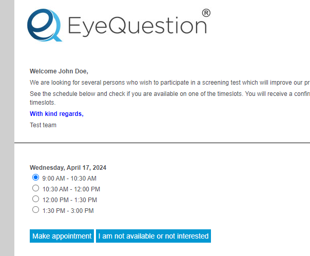 Step 3. Contact the panellist to fill in the screener. Panellists will receive a link to fill in the screener questionnaire created in EyeQuestion. Those who qualify the filtering criteria/s from the EyeQuestion screener will be able to make an appointment in EyeContact.