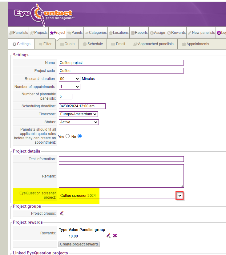 Step 1. Login as project manager in EyeContact and create a project. Link the screener by clicking dropdown arrow.