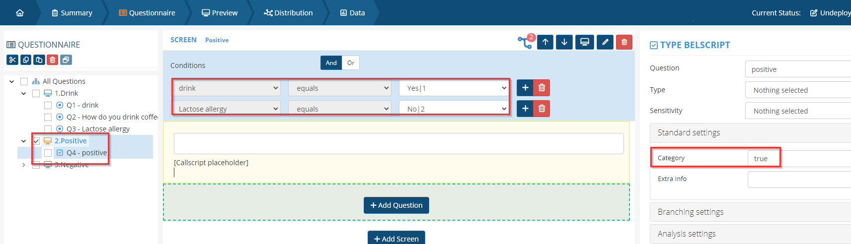 - The positive callscript question should have default value "true" and negative screen should have "false".