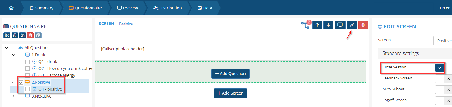 Step 4. Click Questionnaire and add a new screen called "Positive". In that screen add a questiontype named "Callscript (Panelmanagement)". This is a particular question type that ensures that if a panelist meets the filtering criteria, they can schedule an appointment with EyeContact.