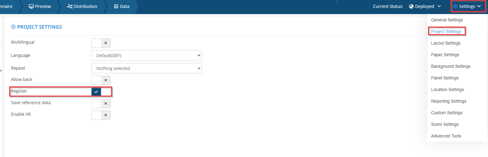 Step 3. Go to Settings>Project Settings and enable "Register".