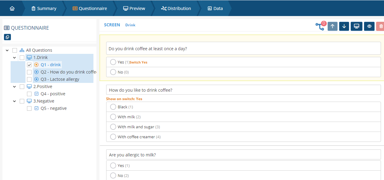 - The positive and negative screens should have only callscript question and no other questions. The filtering questions should be added before the positive and negative screens.