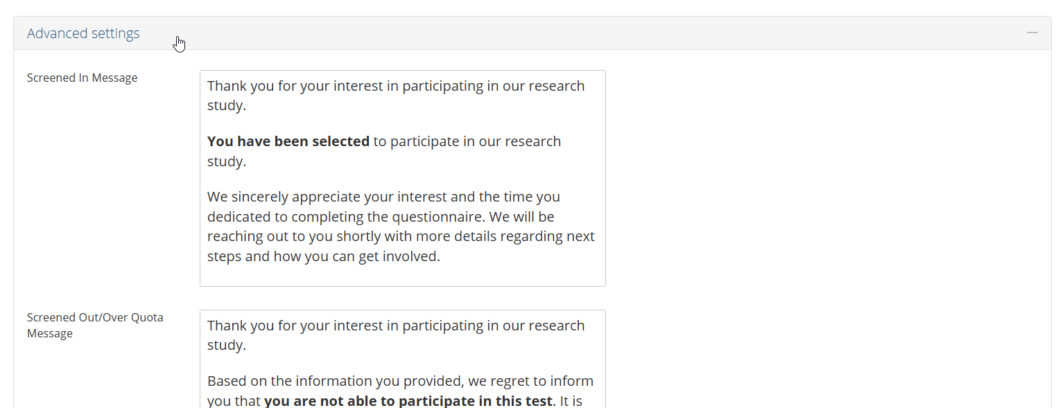 - Show Message: Panellists will see a message indicating whether they are screened in, as soon as they are screened in (questionnaire is not finished).