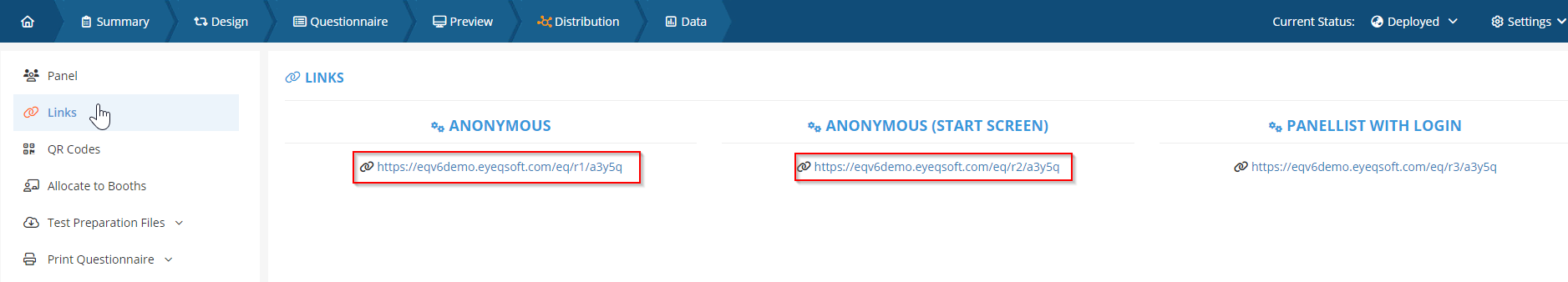 After creating and deploying your questionnaire, go to Distribution>Links and copy the first 2 links(r1 & r2).