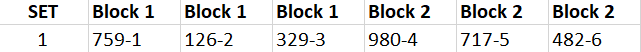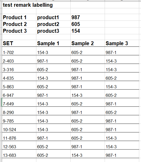 Please keep in mind that if more sets are requested in the Required number of sets option than there are defined in the imported design, then the sets will be copied/repeated automatically. If we use the example design provided in the excel screenshot above and set the amount of sets to '10', the following design will be generated:
