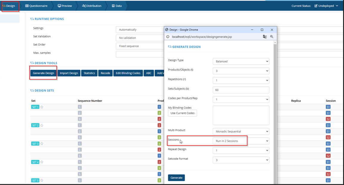Once you have created a design in sessions, your design sets can be visualized in the design section. The column session will now make a distinction across the sessions and highlight those accordingly.