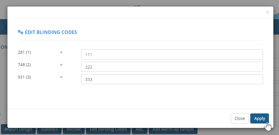 2. The blinding codes on the left side displays the default blinding codes. The user can add the custom blinding code on the right side and click on "Apply".