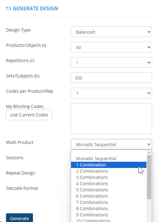 Create a balanced design including all products you want to evaluate (e.g. 40 products). Define in this step if the design should be monadic sequential or block design by selecting this option under "Multi Product". Click Generate Design.