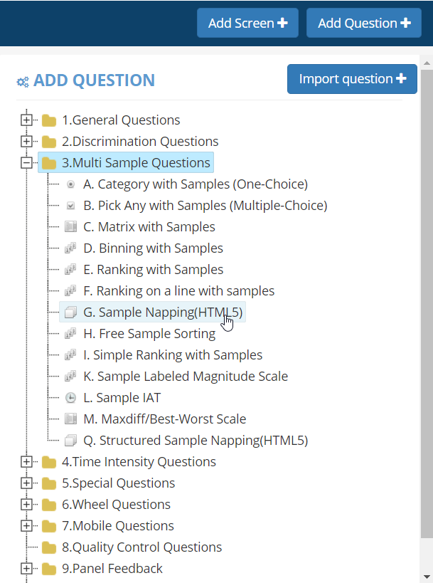 The default napping template is currently not available in the default sensory templates but it will be included in a future updated version of EyeQuestion. Meanwhile, it is possible to create it through adapting the ranking template by adding a "sample napping" question found under ''Multi Sample Questions.''