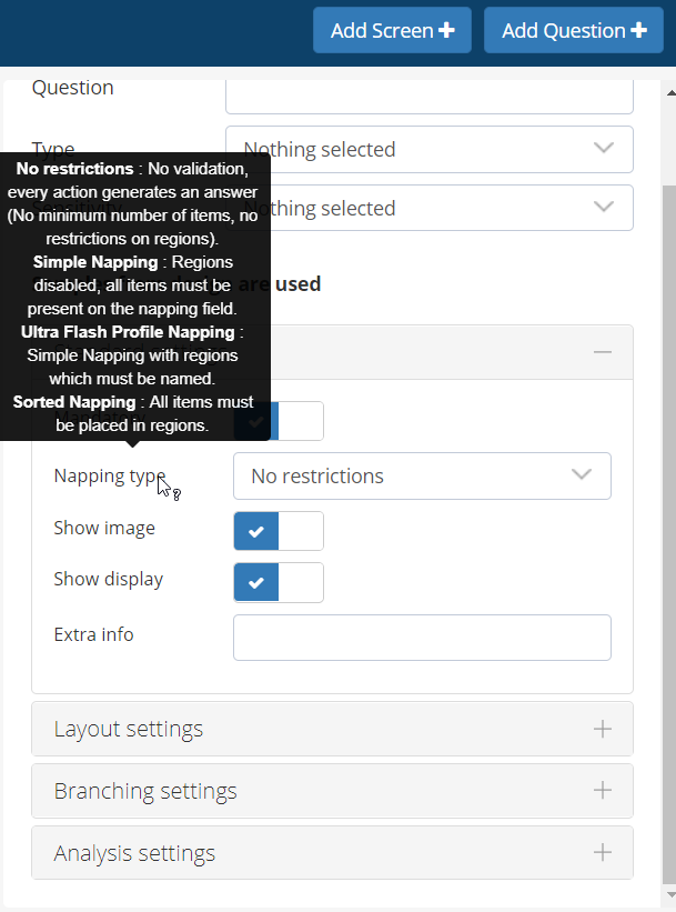 Within this questiontype's settings you have the option to select the type of napping, there are three kinds of napping types and the information about each of them can be found if you hover your mouse over the field name 'Napping type'.