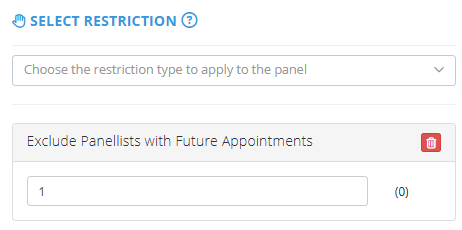 It is possible to create a static panel based on appointment restrictions and past participation. By selection the preferred option from the dropdown under “Select Restrictions”. Based on which option that has been chosen, a new field appears with information on how many panelist excluded. Multiple restrictions can be selected.