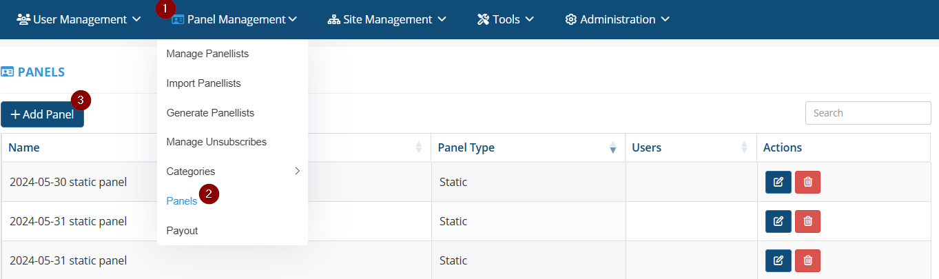 A Panel Manager is able to create panels and view them together in the panel overview. This can be accessed via Panel Management > Panel