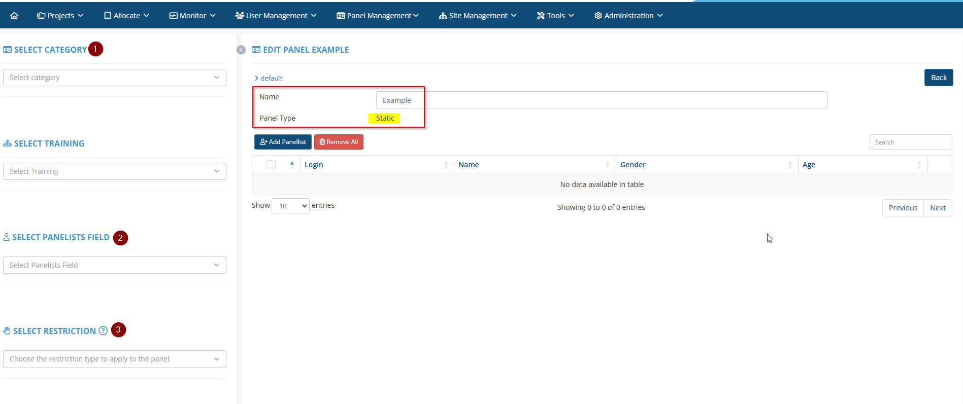 If a user would like to create a static panel based on panelist information, like Age, Gender or City, is now possible to select these options and build a static panel. Depending on which option selected, the user needs to select which range and/or option to create the panel.