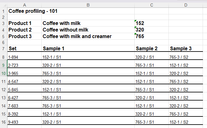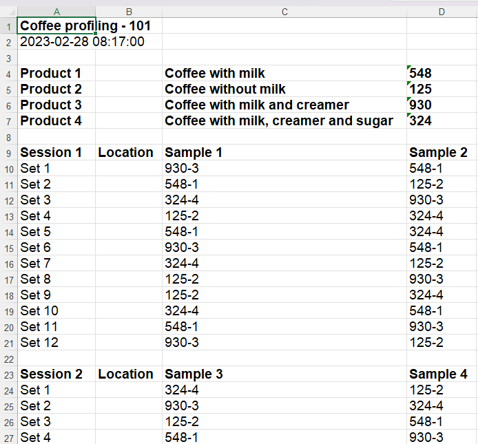 An overview of your design is essential to know which samples to give in what order and to which panelists. EyeQuestion provides you with the option to download this file, which you can then print and provide to the personnel in charge of setting up the test study.