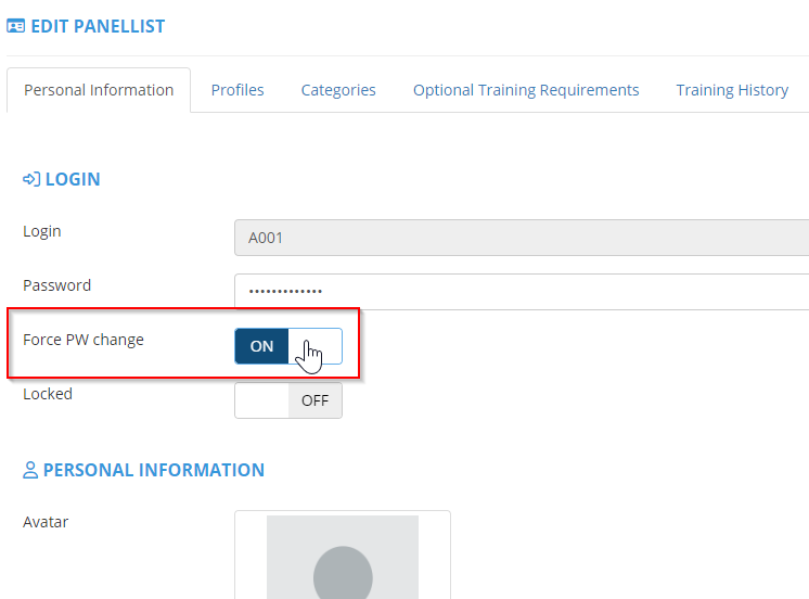 3. In the option ''Personal information'' tab, please ensure that option Force PW change is set to ON.