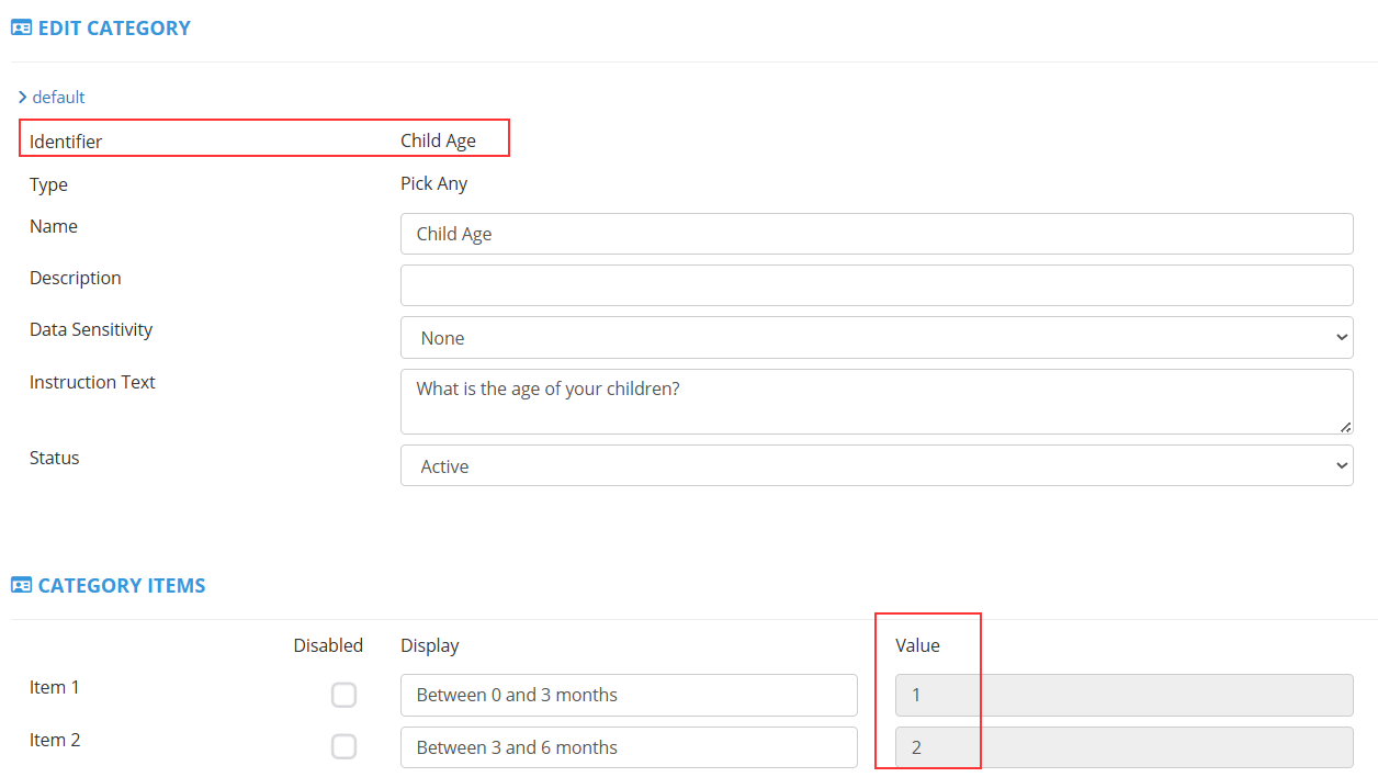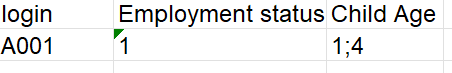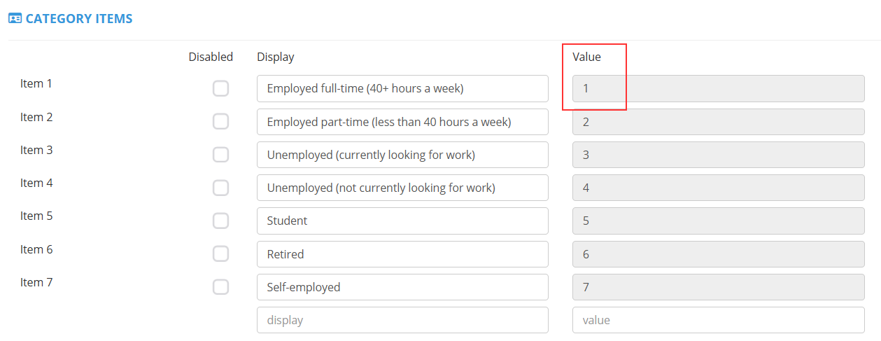 - Single-choice (Category type = Category): Enter only one value corresponding to the selected answer. Example: For Employment status, if the value for "Employed full-time (40+ hours a week)" is 1, you enter 1.