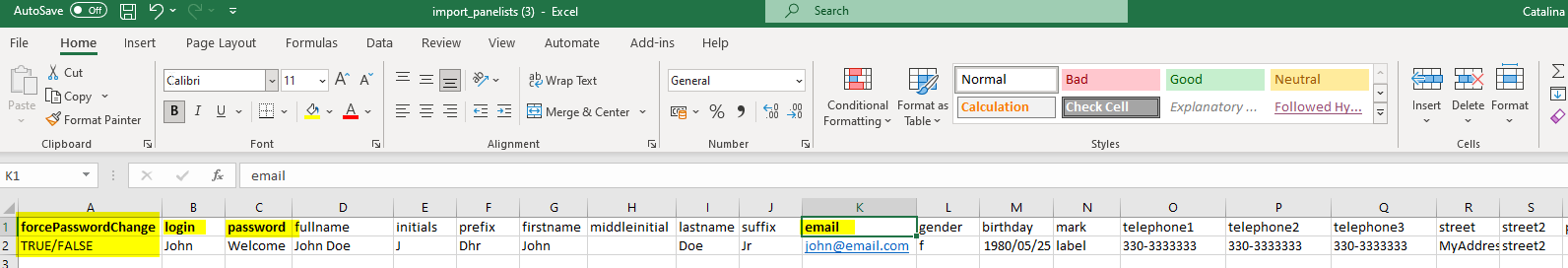 3. In the import file, you can add a column called “forcePasswordChange” and choose the option “TRUE” or “FALSE”. The choice would either enable or disable the option “force password change” in the panellist profile.