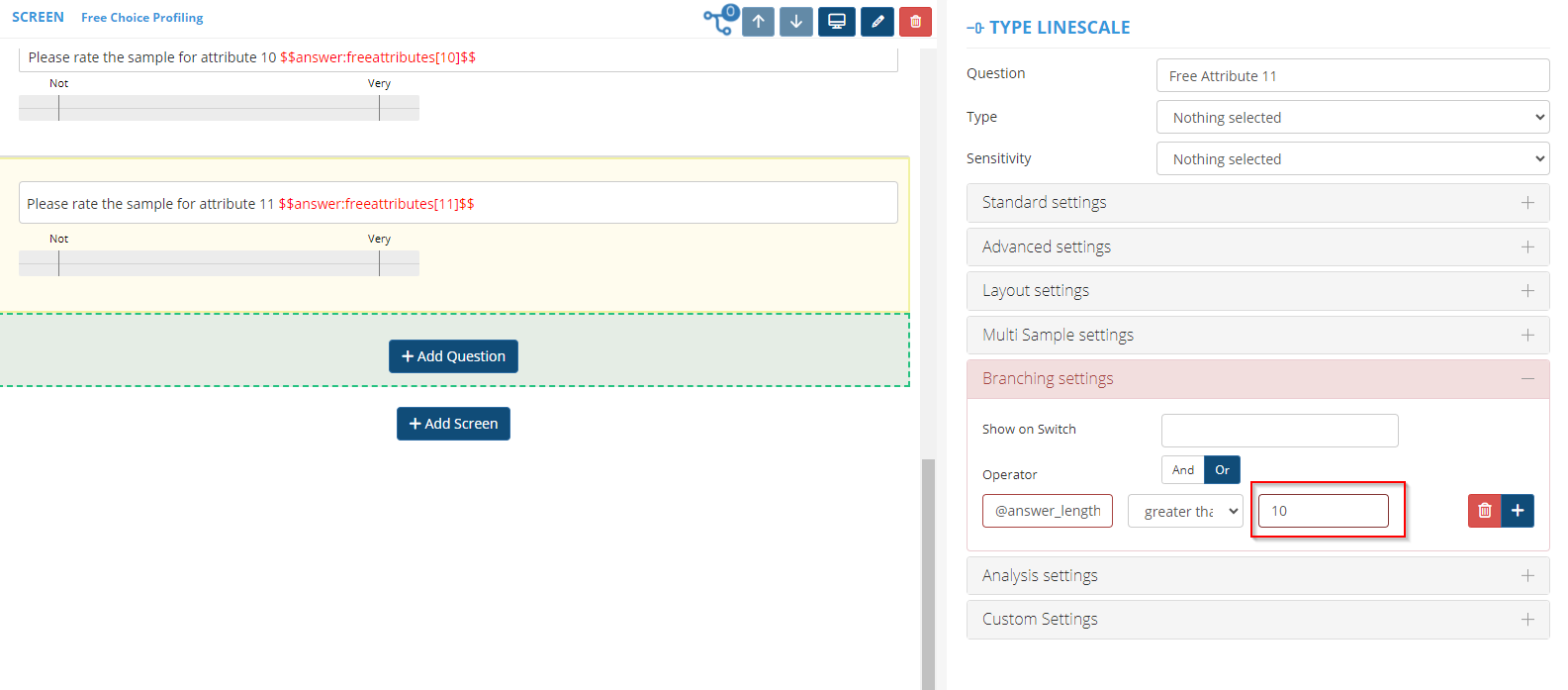 You can specify a particular condition for which the line scale will only appear in the branching settings. In this example we are asking the software to show the line scale for attribute 11 only when the panelist have generated a list of word which include a number of words higher than 10.