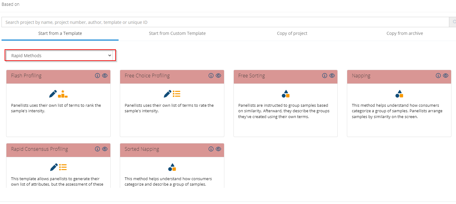 When creating a Flash Profile/Free Choice Profiling you can create the project starting from EyeQuestion premade template which you can find in the Rapid Methods folder. Depending on your license you might be able to see this folder or not. In case you would like to add this option to your system, please feel free to send an email to our support department (