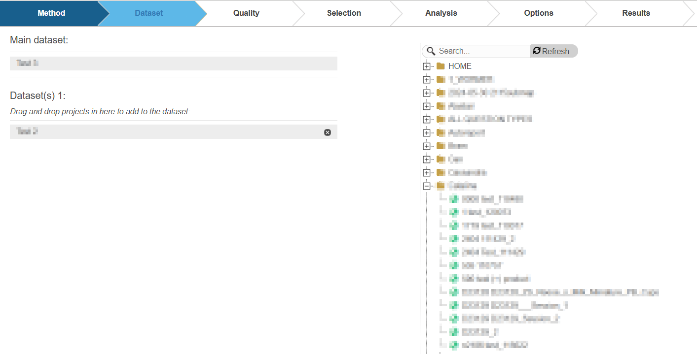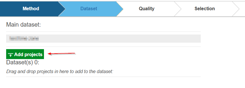 3. In the dataset part, select "Add Projects" and drag and drop from the list of projects on the right of the screen the project you wish to merge with.