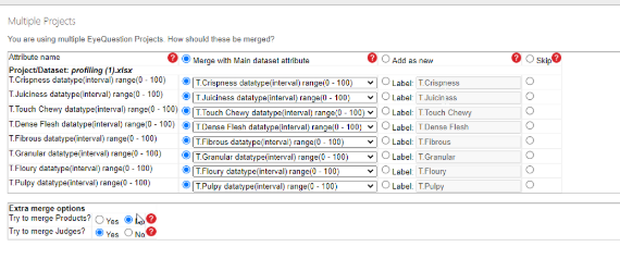 When you proceed to the next screen, in the dialog box, you will see a list of attributes that are common to both datasets. You can choose which attributes you want to merge and which you want to add as new attributes to or skip. You can also select whether you want your products to be merged (if data for the same product was collected in both tests) and whether you want your Judges to be merged (in case in both tests the data have collected with the same panelists).