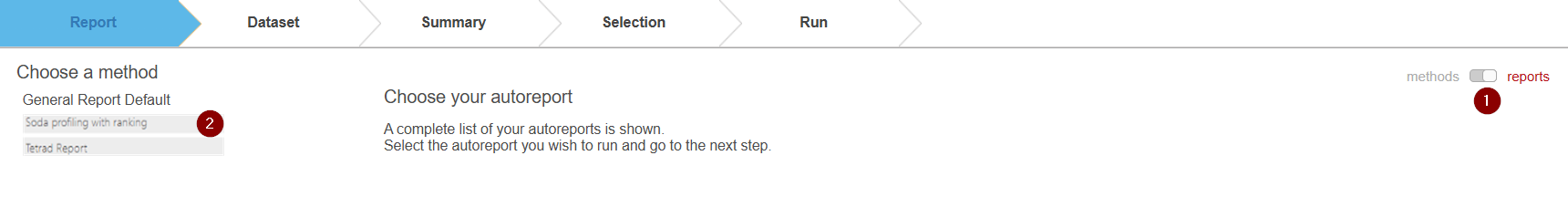 2. In the top right corner switch the toggle button to "reports" and then select the report you wish to use for your analysis.
