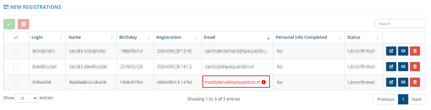 EyeQuestion will flag the duplicate email address in the new registration tab. The user can check if the duplicate email address should be allowed (for example: in a situation where same family members use the same email address) or not.