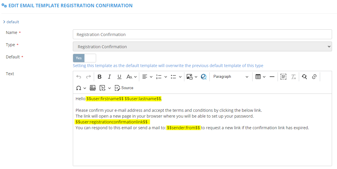 In order to edit these templates click on the edit icon next to it. Please be careful when editing these templates to not remove the placeholders (the ones highlighted in yellow) rest of the text can be adjusted.