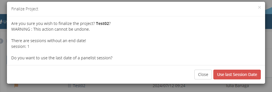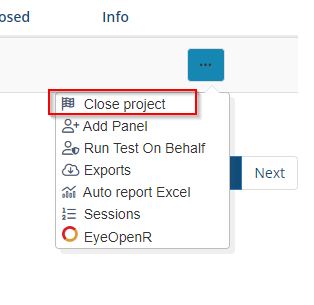 When all panelist have finished their questionnaire or when you want to prevent panelist to start a new session, you can close the project. Closing a project means that it will be not be available for panelists anymore and all open sessions will be closed and the data will be added to the project database. Data from open sessions containing missing data, will be stored in the database. A closed project can be deployed again, if you should decide to collect more data.