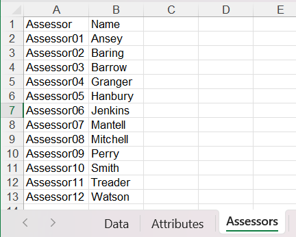 contains the metadata for the judges. The first two columns are fixed, they are called Assessor and Name. The Assessor column