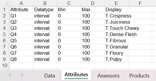 contains metadata for attributes. The first 5 columns in this tab are fixed. they should always contain attribute, datatype, min, max and display.