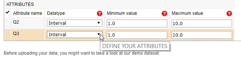to the attribute column. The datatype column contains the datatype of each attribute. There is a fixed list of datatypes to choose from: - Nominal: Categorically discrete data such as name