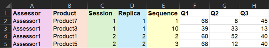 first sheet in your workbook. The first 5 columns are fixed, they contain Assessor, Product, Session, Replica and Sequence. They can only be used as displayed in this