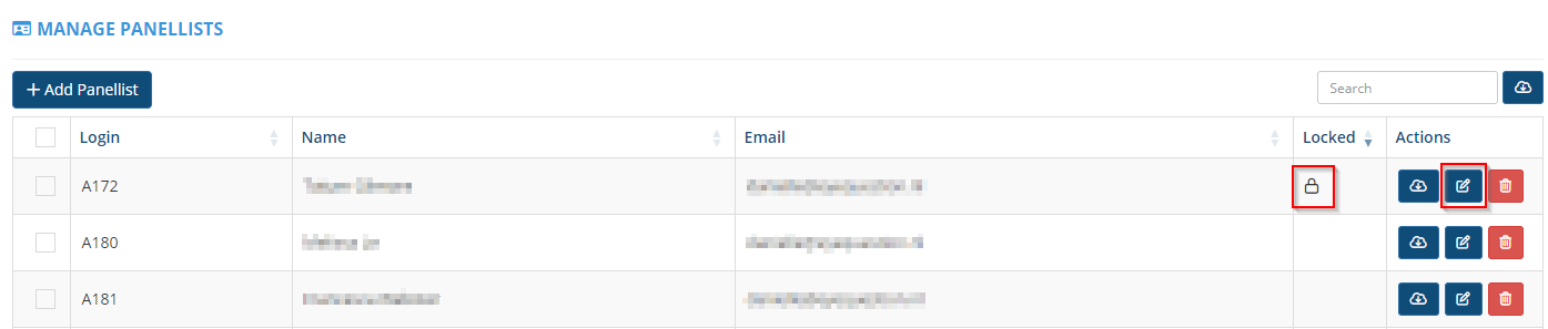 If the account of the panellist is locked, this is indicated with a lock in the panellist overview (Panel Management --> Manage Panellists).