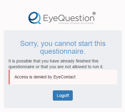 Access Denied by EyeContact : Access to the questionnaire is not granted because the panelist is not in the EyeContact panel related to the project. Change the project settings in EyeContact. The panelist is either not scheduled for the project or the panelist does not fit the filter criteria.