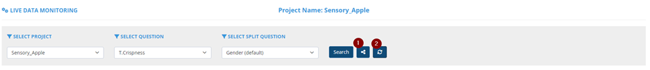 In case the research project is active, it is possible to refresh the table to display the latest results by clicking on the refresh button (2). It is also possible to share the results of the active project with non-users of EyeQuestion by generating a URL from this tool (1) via which non-users can view the results of the given project in the Live Data Monitor.