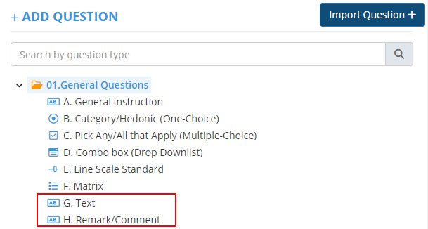 To use the Remark Labelling functionality the questionnaire must contain at least one question of the type General Question --> G-Text or H- Remark/Comment which allows you to collect open ended answer from your consumers or panelists.