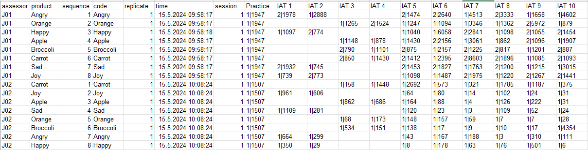 The raw data is displayed with each row corresponding to a product evaluated by a panelist, followed by the response times for each association task. Each column represents a question (Qx), with no distinction between the different design sections in the dataset.