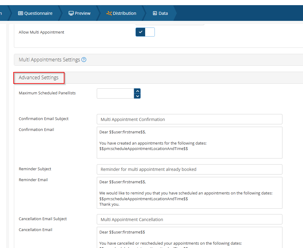 Under the Advanced Settings, users can set up the maximum number of panellists that can schedule an appointment. Furthermore users can modify the default email template's text. By default, the text of the Multi-Appointment default email templates are filled in.