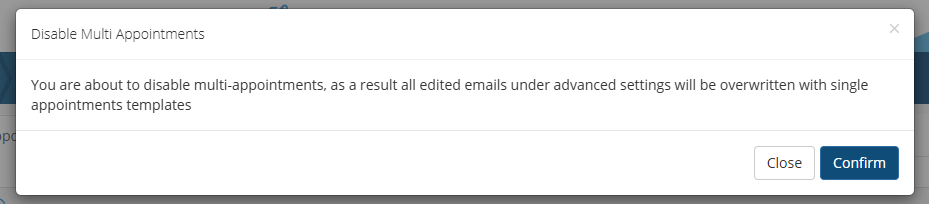 If you adjust the Multi-appointment email's text under the Advanced Settings and then disable the Multiple Appointments toggle, the following warning message will be displayed and if confirmed, the changes you have made will be erased: