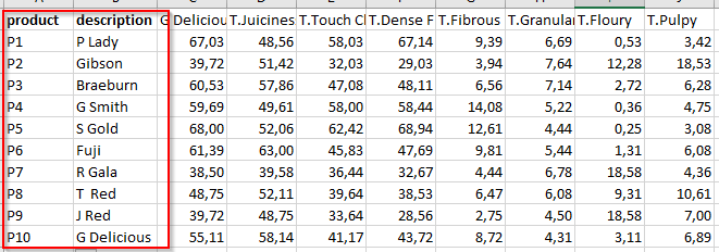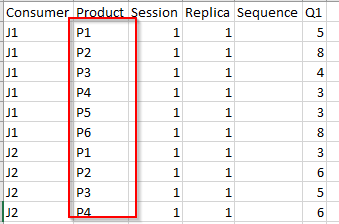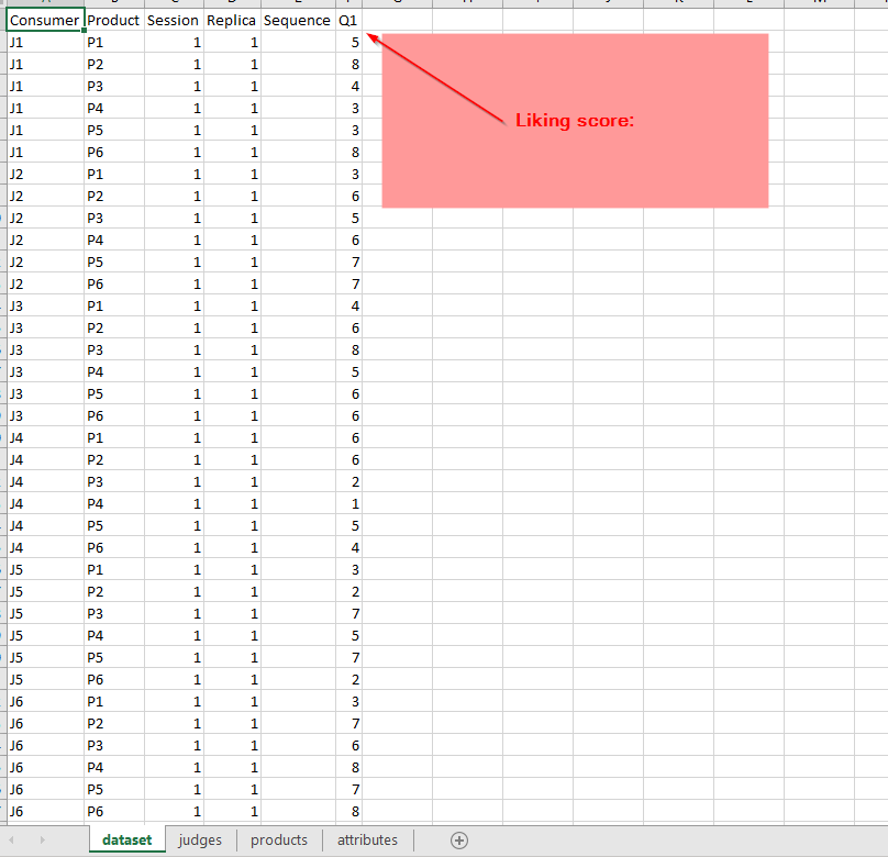 2. From this file, make sure that in the 'dataset' sheet there is only one column which includes the liking score given for each product from each judge (see attached Prefmap_DemoInput.xlsx).
