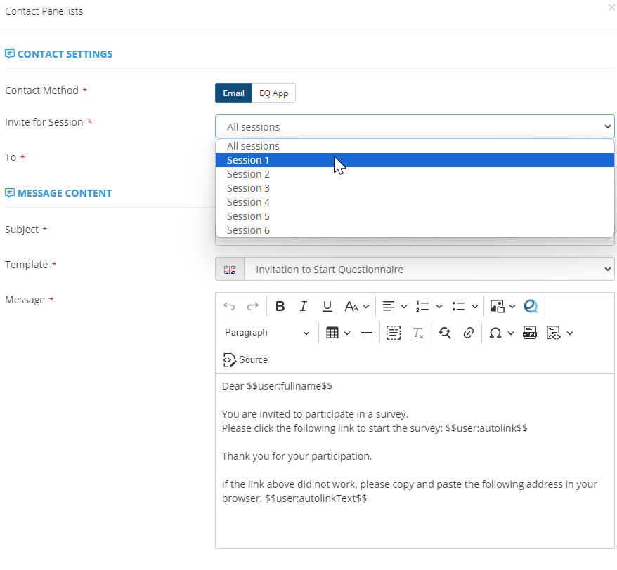 - You can decide to send the questionnaire for all the sessions or just for a specific one.